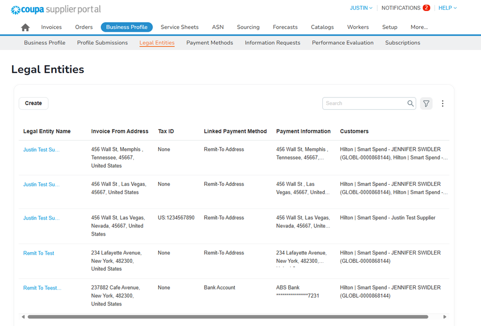 Now in the Business Profile Section. View all of the legal entities you created. Deactivate an entity by clicking on the blue “Actions” button to the right. Add a new legal entity by clicking on the grey “Add Legal Entity” button above the list.”