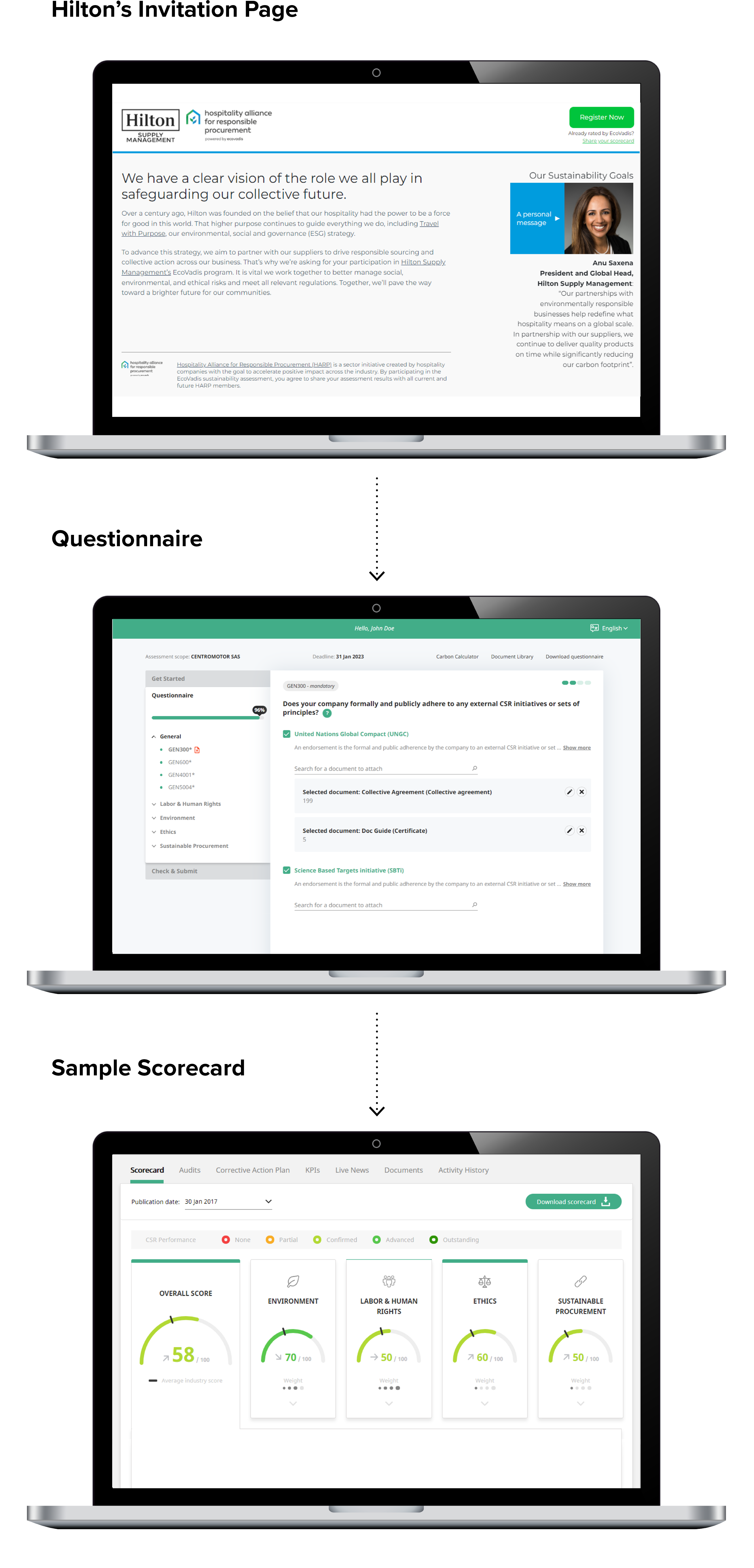 Hilton, along with other major hospitality companies (including Marriott, IHG and Avendra), cofounded the Hospitality Alliance for Responsible Procurement, which seeks to drive supply chain improvements across the industry. This alliance has partnered with EcoVadis as the primary sustainability assessment tool for their suppliers. Your participation in the assessment enhances the impact of your company’s sustainability efforts within the broader hospitality sector.